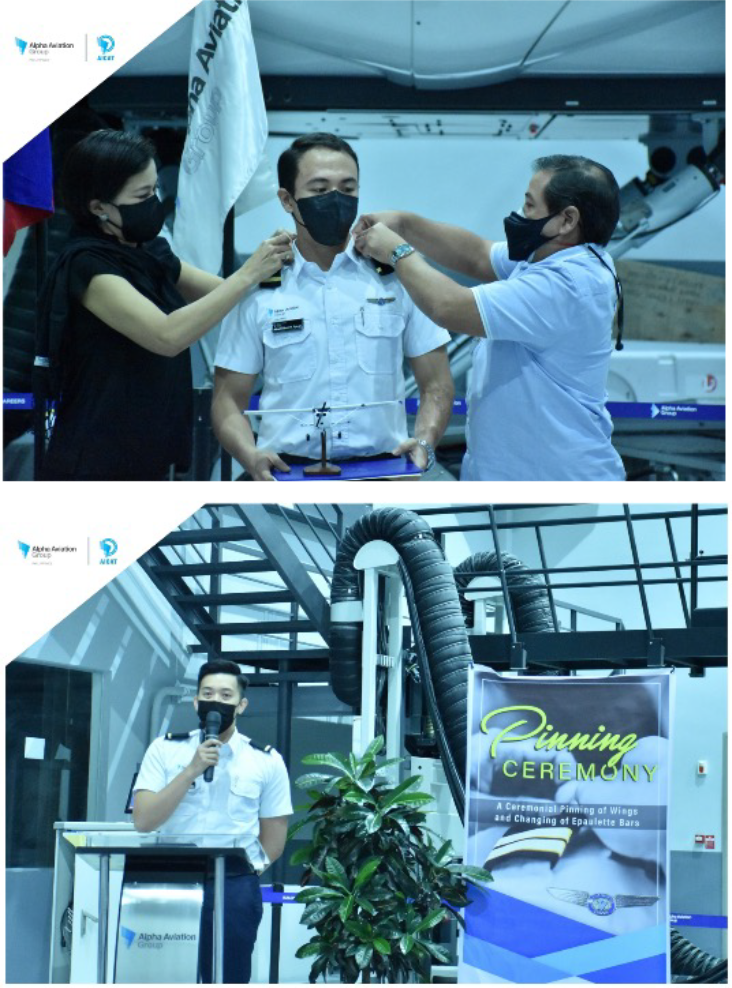 The batch’s Pinning Ceremony, organized by the Student Affairs and Client Relations (SACRe) Department, was held at Simulator Bay 2, AAG Training Center – Annex building. AICAT’s new Head of Training, Capt. Gimby Cervania, formally opened the ceremony with his warm and firm welcome address, assuring the cadets that the training team will continue inculcating the knowledge, skills, and discipline needed for them to successfully complete the program. This was followed by an informative and inspiring congratulatory remarks from AAG’s Regional Director for Asia Pacific, Mr. Cristopher Magdangal. He underscored the value of adopting and implementing CBTA philosophy across all training modules and phases as a key enabler in training and developing the kind of pilots the industry needs as it navigates the path towards recovery. RD Cris also urged the cadets to keep their passion, commitment, and enthusiasm as they advance to the next phase of the training program, stressing that the first solo flight may be the most difficult and nerve-wracking experience they’ve came across so far, but it’s actually the easiest part of