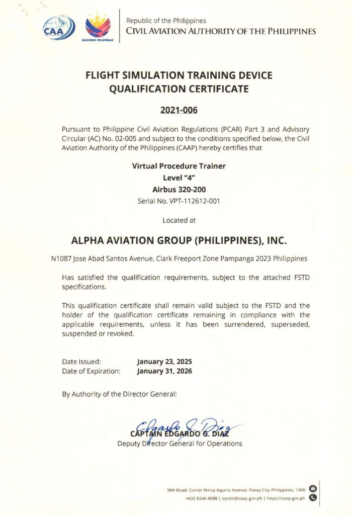 CAAP Qualification No. 2021-006 A320-200 Virtual Procedures Trainer Level 4By aag-webdev / August 21, 2025